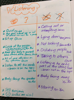 We made two lists (if you can read the fast writing). The left hand side is what listening looks like and sounds like. The right side is what listening does not look like or sound like.